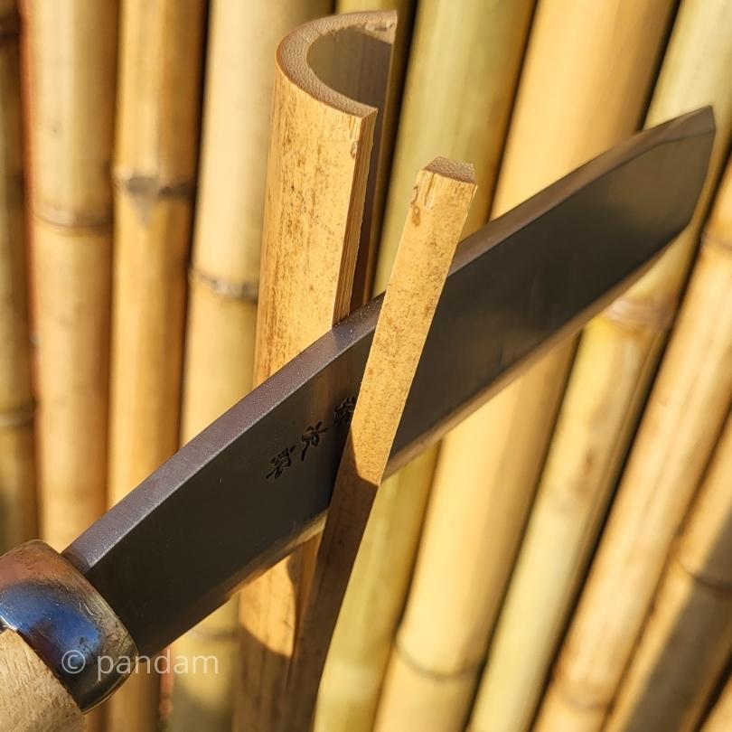 La hoja afilada de esta hacha también le permite quitar los diafragmas de los nudos de las tiras de bambú que obtenga.